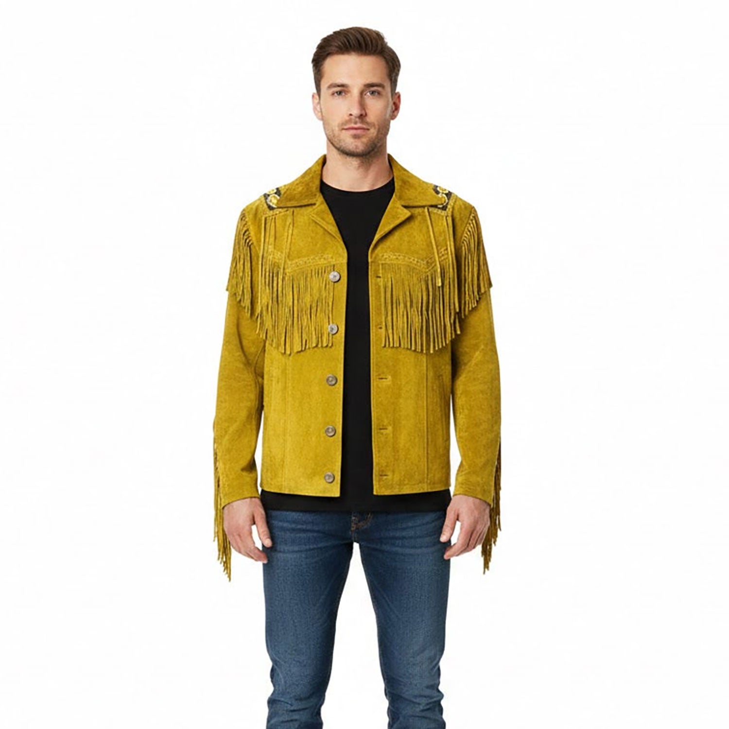 This Western tan suede leather fringe cowboy jacket is a timeless piece that brings classic western style to any wardrobe. The soft tan suede feels buttery and comfortable, while the long fringe adds movement and playful energy. Its cowboy-inspired cut and flattering fit make it easy to layer over jeans, skirts, or dresses, giving any outfit a bold, western-inspired vibe. Perfect for casual outings, festivals, or adding a touch of rugged charm to your everyday style.